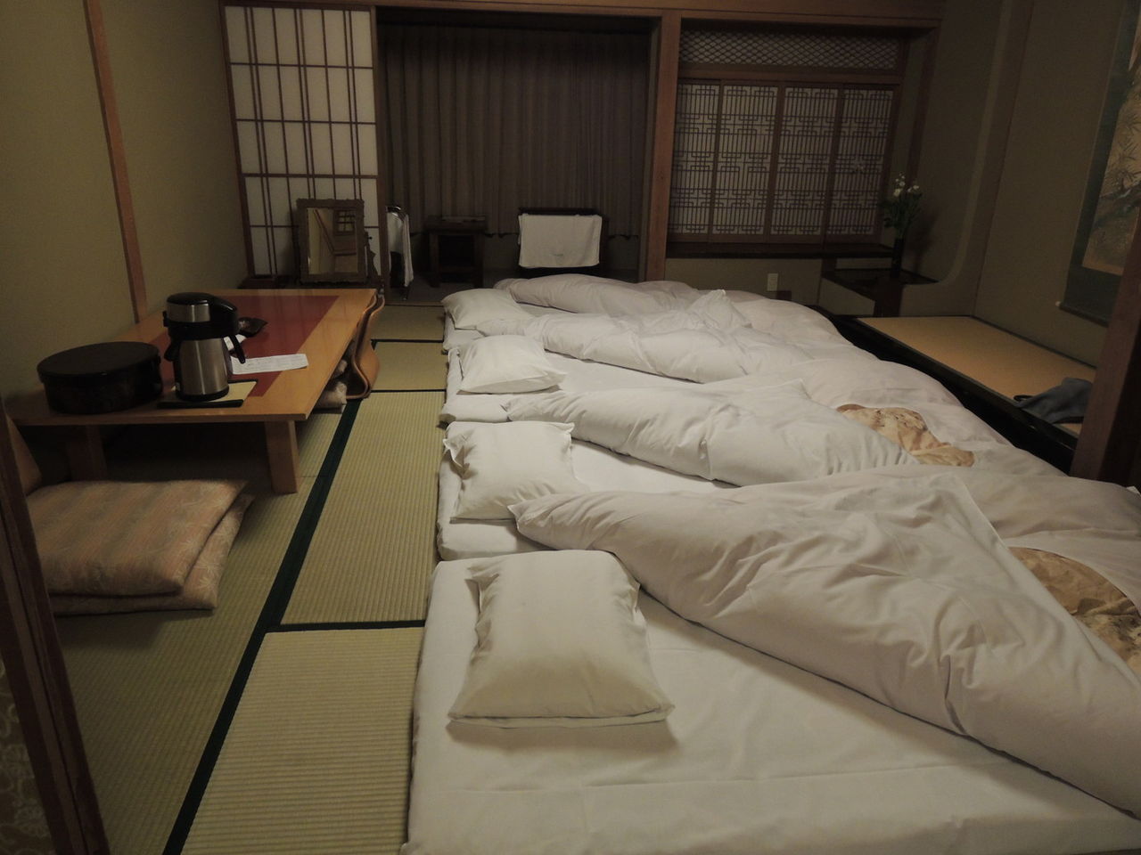 部屋へ戻るとお布団が敷かれています。10帖+6帖で襖があるので早寝組と遅寝組で別れて寝ることにしました