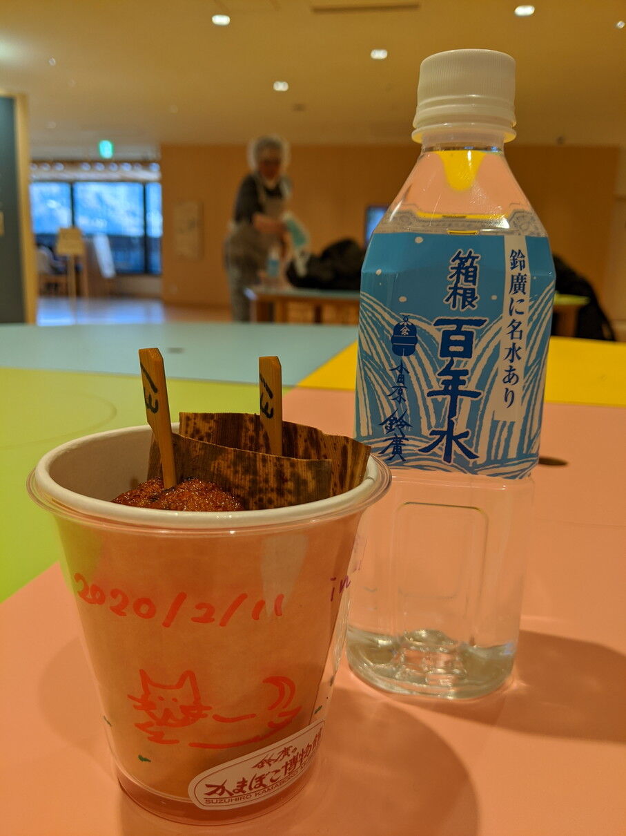 調理中の写真は手がべたべたなので撮れません。練り物に好きな具材を混ぜて形を作る。揚げてもらう。その間にプラスチックのコップに好きな絵や文字を書いて待つ。