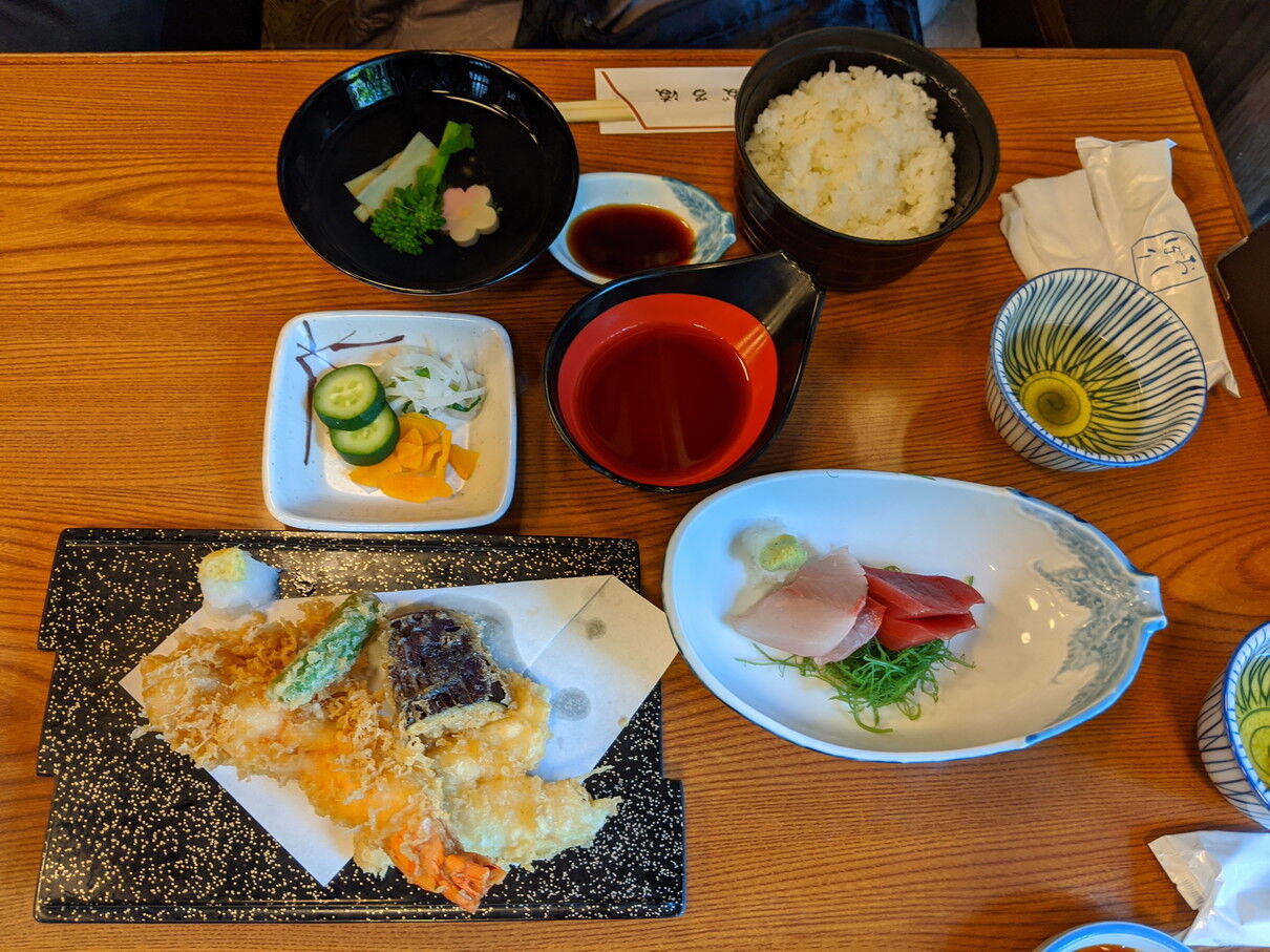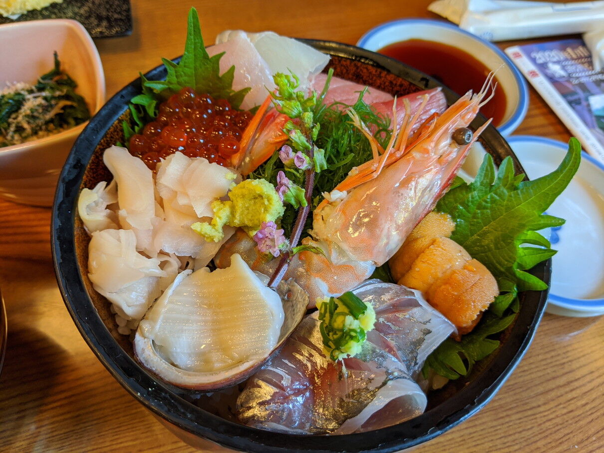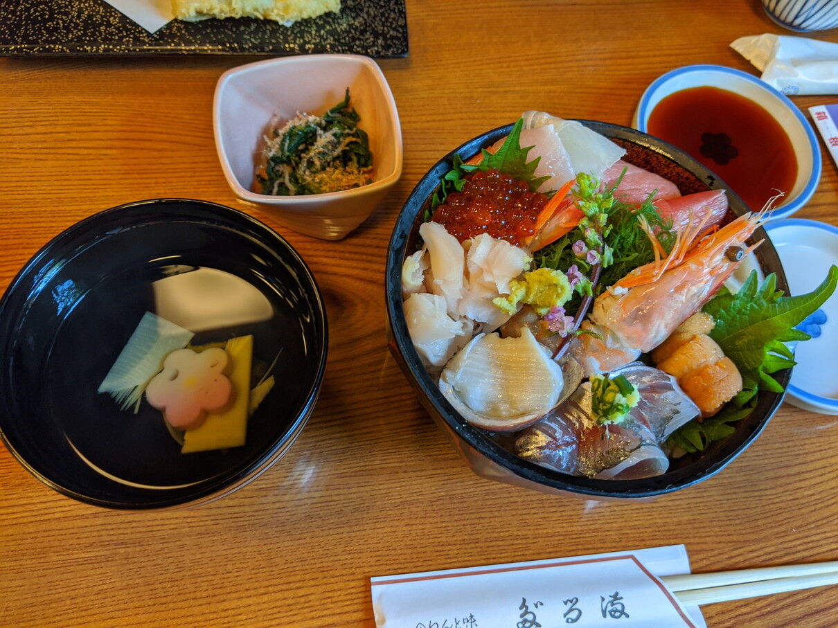 生ものが食べられないので天丼を食べました。美味しかったかと聞かれれば「普通」天丼て特別美味しいとかあるのか?ベタベタしていない限り余り味の違いがわからない・・・・。海鮮ちらしは豪華で美味しそうでしたよ。